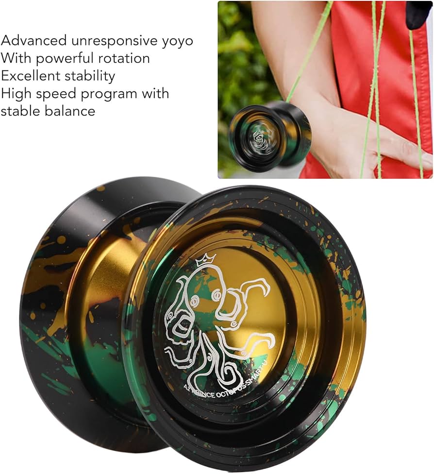 El Yoyo Beboo A2 Profesional Fire Octopus – Black Gold Green es un yoyo de nivel profesional, diseñado para jugadores exigentes que buscan potencia, estabilidad y un diseño único. Fabricado en metal de alta calidad, destaca por su impresionante gráfico del Fire Octopus y su elegante combinación de colores negro, dorado y verde, que le otorgan una apariencia agresiva y premium.